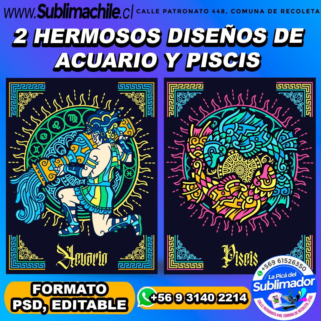 2 Hermosos diseños estilo azteca de los signos del zodiaco "piscis y acuario" para sublimar.