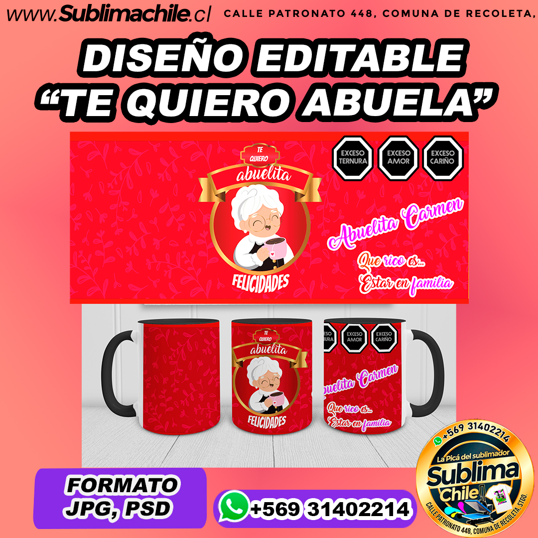 Diseño editable de «abuela te quiero» para sublimar tazones – JPG, PSD EDITABLE