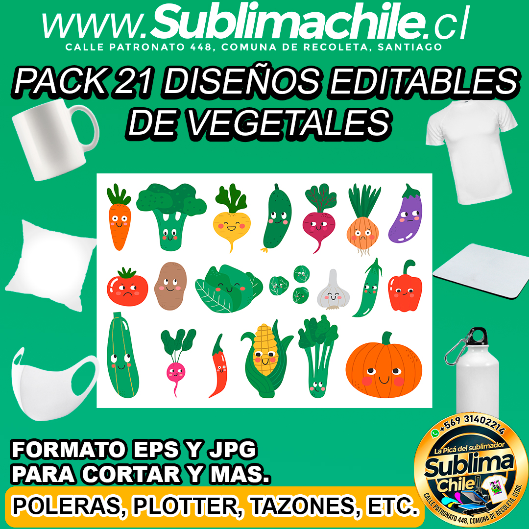 Pack de 21 diseños editables de vegetales para sublimar – EPS, JPG